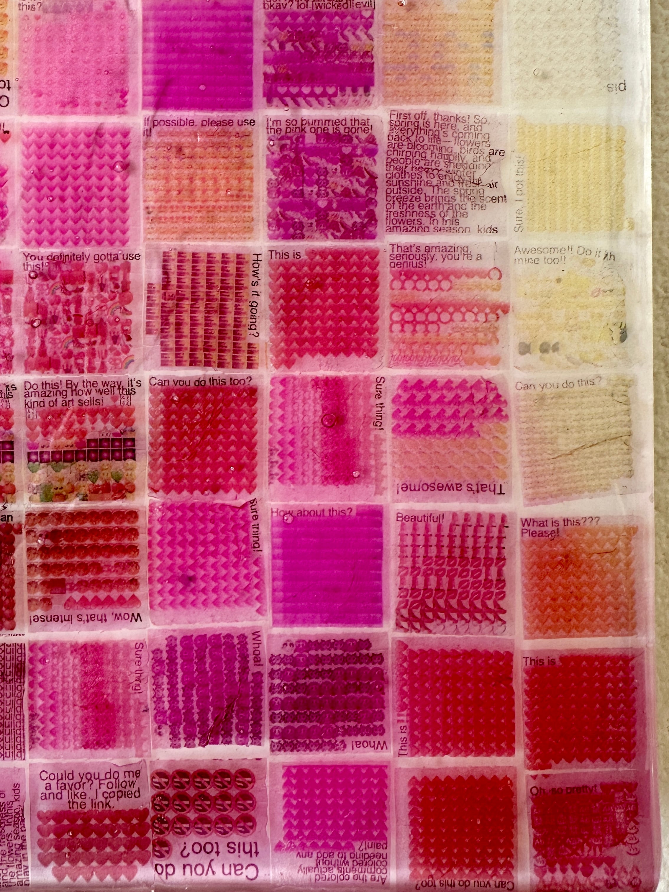 Up close, the piece reveals a dense accumulation of words, emotions, and traces of communication.